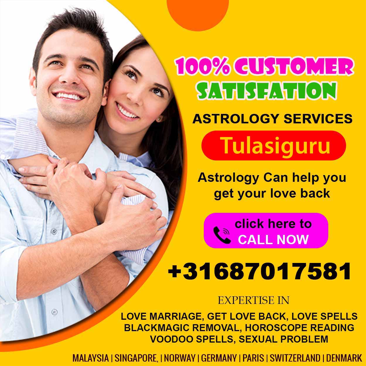 I and my girlfriend were having a happy relationship. Somedays before, we started having constant fights with each other and one day she said she wants to have a breakup with me. I was totally aghast and dejected as it came as a shock for me. But all thanks to Astrologer Master Tulasi Guru, my friend told me about him. He helped me get my ex back and we are now married. Thanks Master Tulasi Guru ji.